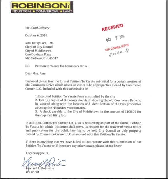 At the September 8, 2010, Middletown Planning Commission meeting, developer Lenny Robinson stood before the Commission and said that he was formally withdrawing his petition to the city to vacate what will be the old Commerce Drive off SR 122 East of I-75. He said that it would be done in writing the following morning.